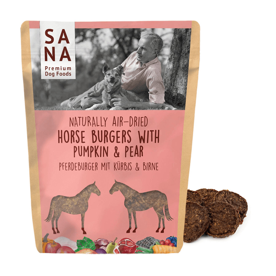 A SANADOG lóhús burgerek sütőtökkel és körtével tiszta, kiváló minőségű lóhúsból és egészséges szuperélelmiszerekből készülnek kutyád számára.